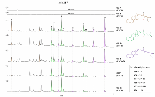 304.cam永利集团朱钢添副教授团队选取南襄盆地泌阳凹陷原油作为研究对象,通过气相色谱-质谱(GC-MS)、全二维气相色谱-飞行时间质谱(GC×GC/ToF-MS),系统分析了一系列母源关系接近但生物降解等级不同的原油样品中的甾烷酸分布。GC-MS分析结果表明,在未降解和低降解等级的原油样品中,未检出甾烷酸信号,只有在生物等级较高(规则甾烷开始发生明显降解)的原油样品中才能检测到甾烷酸,说明该类酸性生物标志物是甾烷的生物降解产物(图1)。