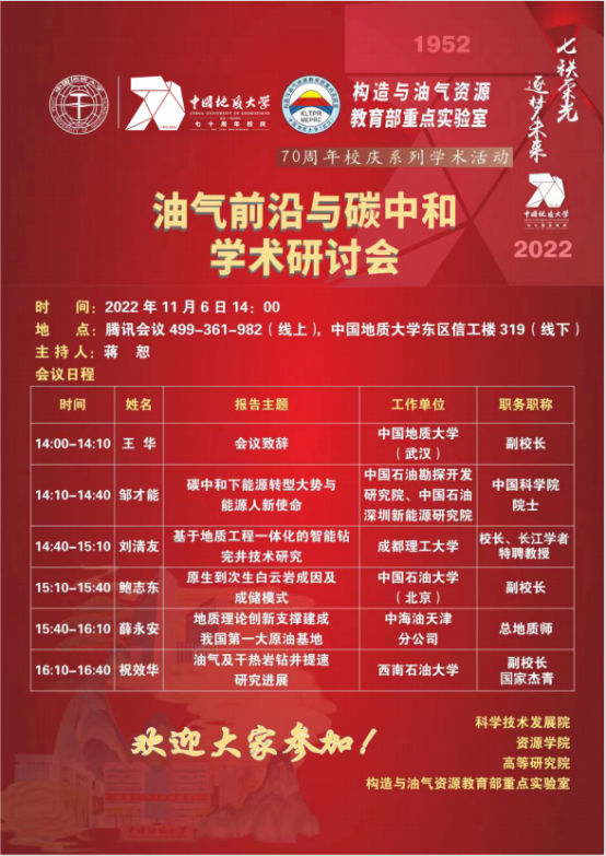 为深入学习贯彻习近平总书记关于能源资源工作的重要论述和习近平总书记给山东省地矿局第六地质大队全体地质工作者的重要回信精神,主动服务融入新一轮找矿突破战略行动和国家“双碳”战略,服务国家能源资源安全重大需求,在永利集团304am建校70周年校庆之际,举办“油气前沿与碳中和”学术研讨会,特邀行业內院士专家,聚焦油气前沿,抓住碳中和发展的关键机遇,开展油气和地热等新能源勘探开发理论和技术前沿研讨,推动有组织有前瞻性的研究和创新,为能源资源高效勘探开发提供理论与技术支持。