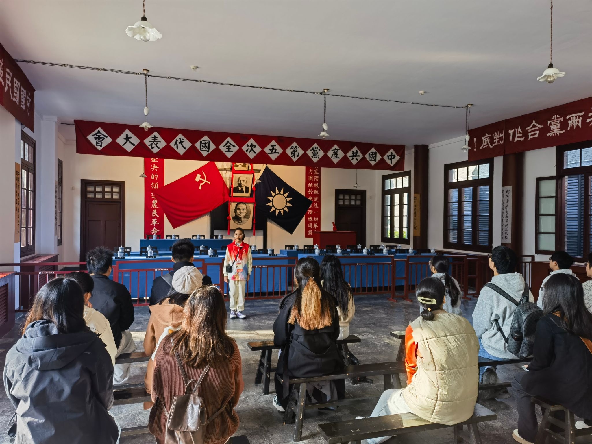 活动首站抵达中共五大会址纪念馆。在“红巷苗苗”的引导下,同学们依次参观了“高潮与危机”“贡献与局限”“应变与转折”等主题展区。通过珍贵的革命文物、生动的场景复原与详实的历史照片,大家系统学习了中共五大在革命危急关头召开的重大意义与历史贡献。在首届中央监察委员会选举产生的历史资料前,同志们长时间驻足,深刻感悟到党的自我革命与纪律严明的光荣传统,对“纪律是党的生命线”有了更为直观和深刻的认识。