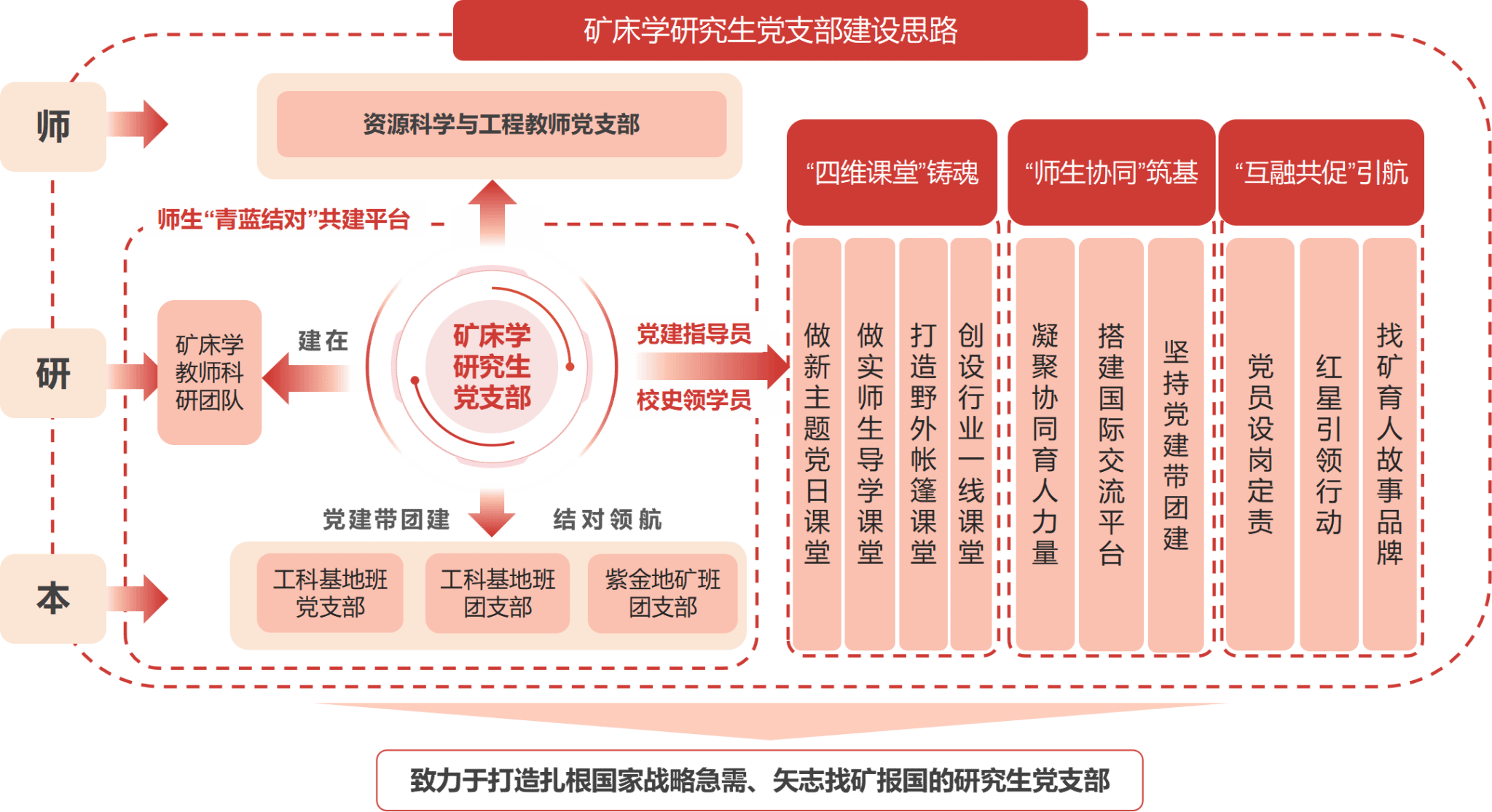 做实师生导学课堂。支部建在矿床学科研团队上,打造4个导学空间,开展导学第一课、导学微项目、最美致谢词等活动,构建和谐导学关系,凝练关键金属找矿突破为团队攻坚方向。