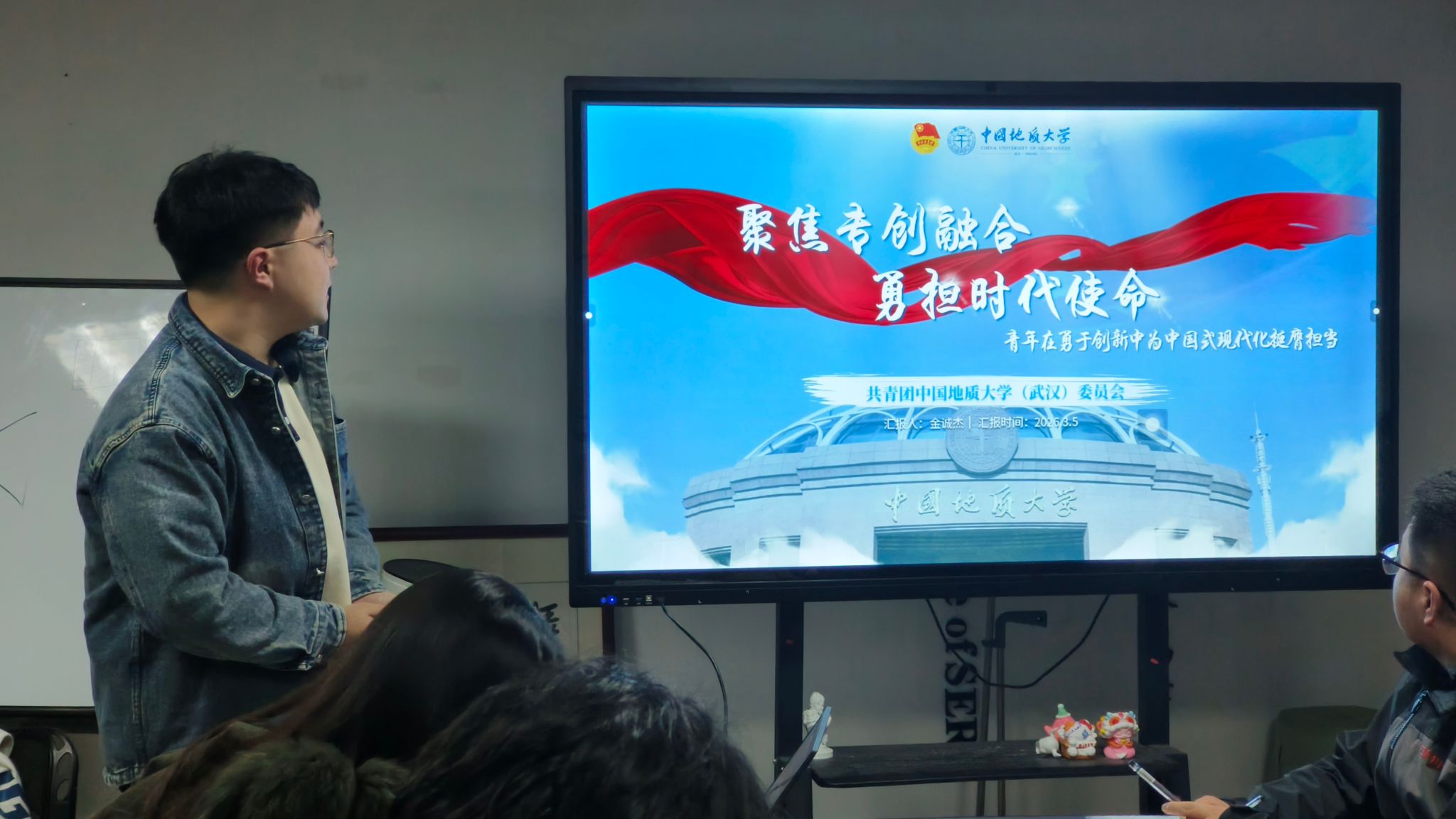 在主题学习环节,金诚杰做了《聚焦专创融合 勇担时代使命》的“挑战杯进院系”的专项主题宣讲。他重点讲解了“挑战杯”赛事要点,全面讲解备赛要素与参赛指南。在工作布置环节,刘睿从党建带团建推进团学组织优化、学风建设、本科生全员开展科研立项训练、本研协同的五育并举活动体系、科普志愿服务体系建设、“资源人”形象建设等方面布置了重点工作。