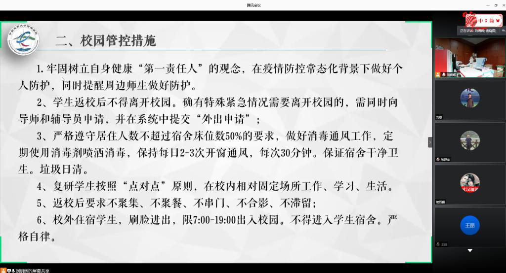 张建华总结发言。他指出,每一位同学都要牢固树立“自己是健康安全的第一责任人”的观念,做好“带口罩”“不聚集”“勤通风”等的防疫要求,对自己负责、对他人负责,珍惜来之不易的疫情防控成果。他表示,目前疫情的发展还存在很多的不确定性和不稳定性,各位同学都要积极配合公司的工作要求,在满足防疫要求的前提下积极开展科学研究、体温上报、毕业离校等各项工作。他希望,每一位资源学子要砥砺爱国心、报国志,努力锤炼品格、锻炼本领,为中华民族伟大复兴的中国梦贡献青春力量!