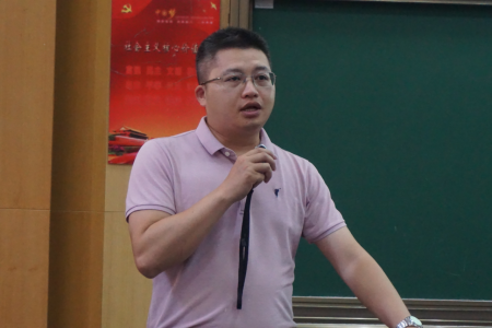 霍少孟老师在主持时对因疫情暂缓返校员工实习任务安排、实习宣传工作、防疫防暑和安全注意事项进行说明。