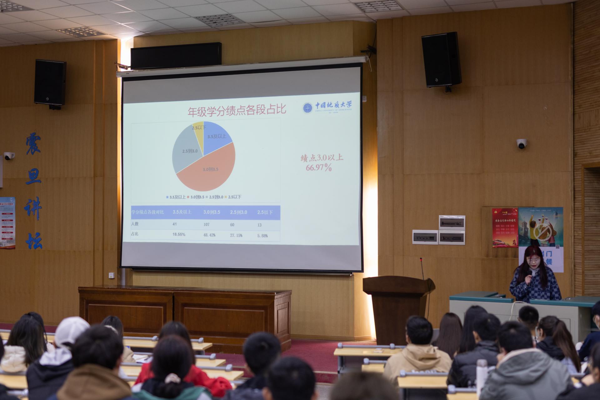 学习专员李佳乐做学情分析报告。她分析了年级整体学习成绩,对各班成绩和重点学科成绩做了对比分析,展示了年级学分绩点3.5以上同学、各班前三名和学霸宿舍。数据显示,2022级本科生平均学分绩点3.15,学分绩点3.0以上员工占比66.97%,但同时也存在学科之间、班级之间和班级内部两极分化的问题。她提到,本学期将持续开展集体晚自习、云自习、月考、基础科目辅导等学风建设系列活动。
