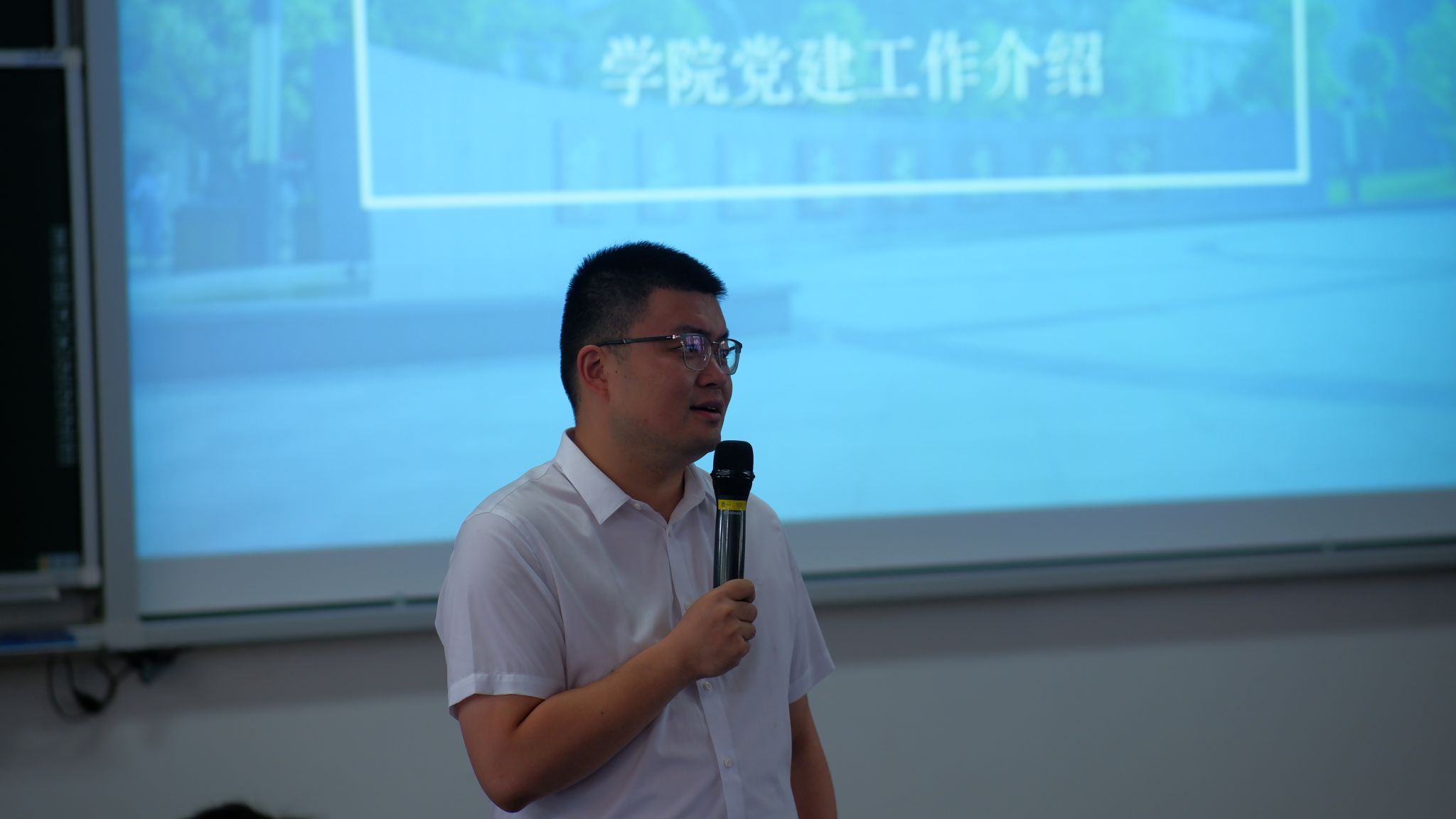 辅导员彭鑫介绍了公司党建工作情况,包括党组织架构、入党流程及党组织关系转接政策等。他鼓励新生们积极向党组织靠拢,坚定理想信念,多参加志愿活动,在学习和生活中发挥先锋模范作用,为实现中华民族伟大复兴贡献青春力量。