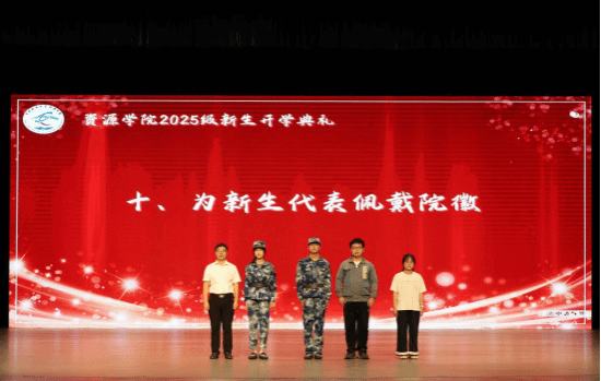 公司党委书记汪再奇老师为新生代表佩戴院徽。