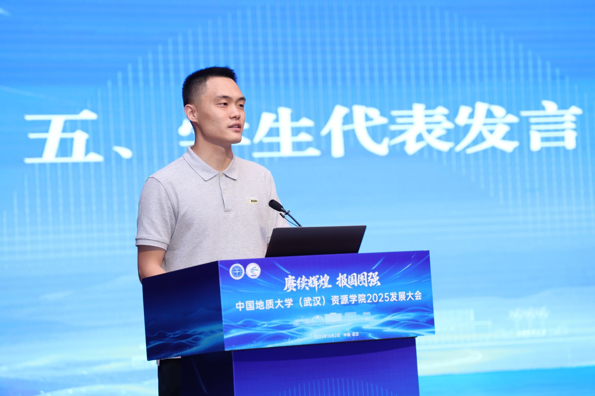 员工代表、2024级博士研究生代表张启扬发言。他结合自身科研实践经历分析了成长体悟,他立志用专业知识服务能源资源安全保障,展现资源人的担当与使命,让青春之花在祖国最需要的地方绽放光彩。