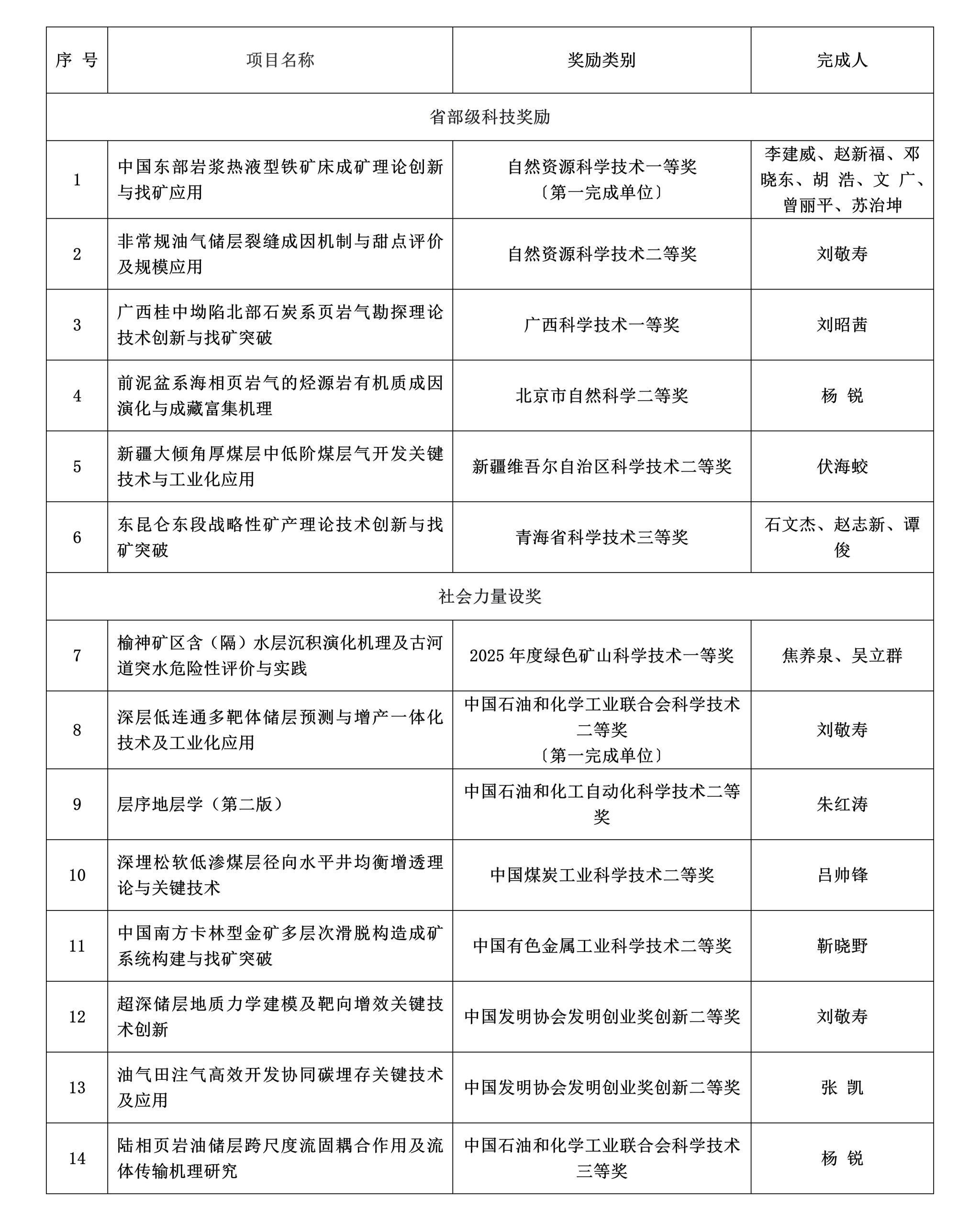 (通讯员 徐 佳)在公司“十四五”规划实施的引导支持下,304.cam永利集团在油气资源勘查开发、战略矿产找矿突破、绿色矿山建设等领域取得标志性成果,2025年度共斩获14项重要科技成果奖,涵盖省部级科技奖励与社会力量设奖,公司作为第一完成单位获自然资源科技进步一等奖1项、中国石油和化学工业联合会科技进步二等奖1项;作为参与单位获一等奖2项、二等奖8项、三等奖2项。