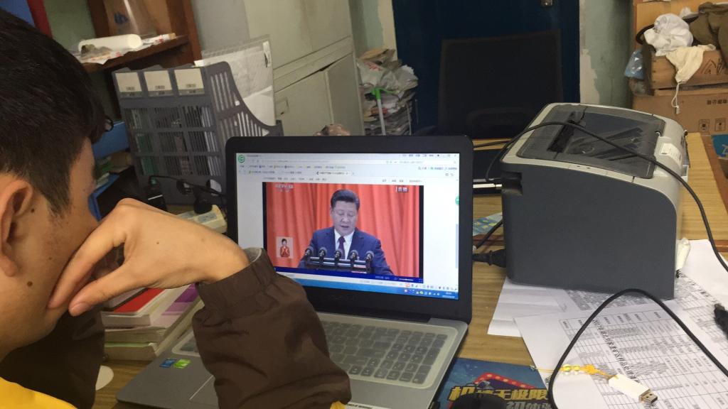 员工党员在办公室观看十九大开幕会
