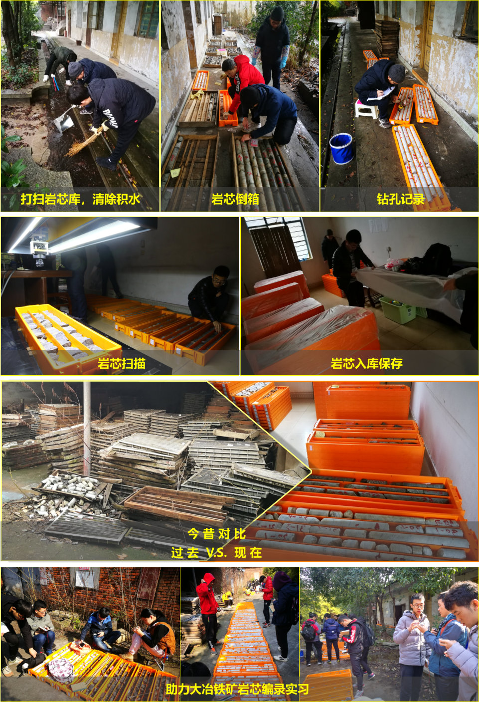 2019年2月26日至3月9日,矿产资源形成与勘查开发国家级虚拟仿真实验教学中心、304.cam永利集团陈志军老师团队及合作公司技术人员前往大冶铁矿开展了11根典型钻孔的岩芯倒箱、岩芯图像扫描工作。大冶铁矿岩芯库所在的钻机队用房常年处于无人管理状态,钻孔堆放混乱、岩芯箱损毁严重,对典型岩芯亟需加强保护以便资源勘查工程(固体方向)专业的岩芯编录实习常态化开展。