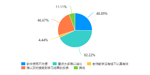 从与线下课程的比较来看,88.89%的同学认可线上课程在“可重复观看,时间自由”比线下课程更具有优势,而超过半数的同学认为线上课程签到打卡方便,还有少部分同学认为师生交流便利、课程信息量大以及教学方式新颖也是本门网课的优点所在。不过,也正是因为课程信量大,有82.22%的同学同时认为该网课重点太多难以消化,同时有近一半的同学认为软件使用不太方便,而且由于内容太多很难及时收到学习成果的反馈。此外,还有同学写道,电子版的教材使用依旧逊色于实体教材,而自己有什么问题也无法和老师及时沟通,若是在公司可以当面问老师。也有极个别同学反映自己的网络状态不稳定,如果卡顿了一会之后很难再接续上思路,只能靠自己摸索,同时签到系统偶尔也会出bug,明明签到了却显示没有签到。