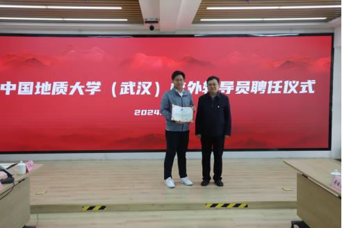 高复阳为地矿测绘院副总经理、大数据中心主任王明果员工颁发校外辅导员聘书。