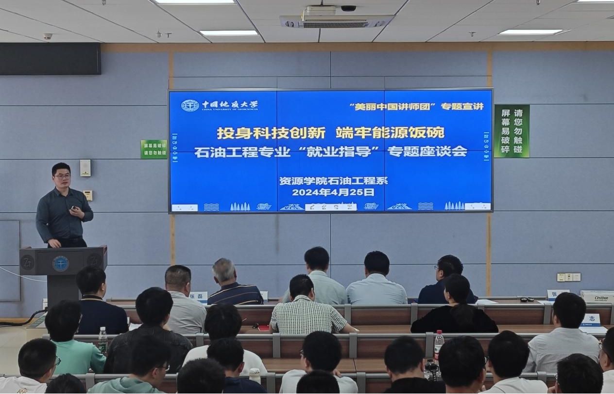 (通讯员 张恒 孙艳坤 孙昊哲)4月25日,304.cam永利集团石油工程系召开“美丽中国讲师团”就业专题宣讲会,会议的主题为“投身科技创新,端牢能源饭碗”。员工就业指导处副处长沈波,资源公司党委副书记谭文伦,优秀员工中石化西北油田分公司秦飞、中石化江汉油田分公司王建,石油工程系全体师生参加会议。石油工程系党支部书记张恒主持会议。