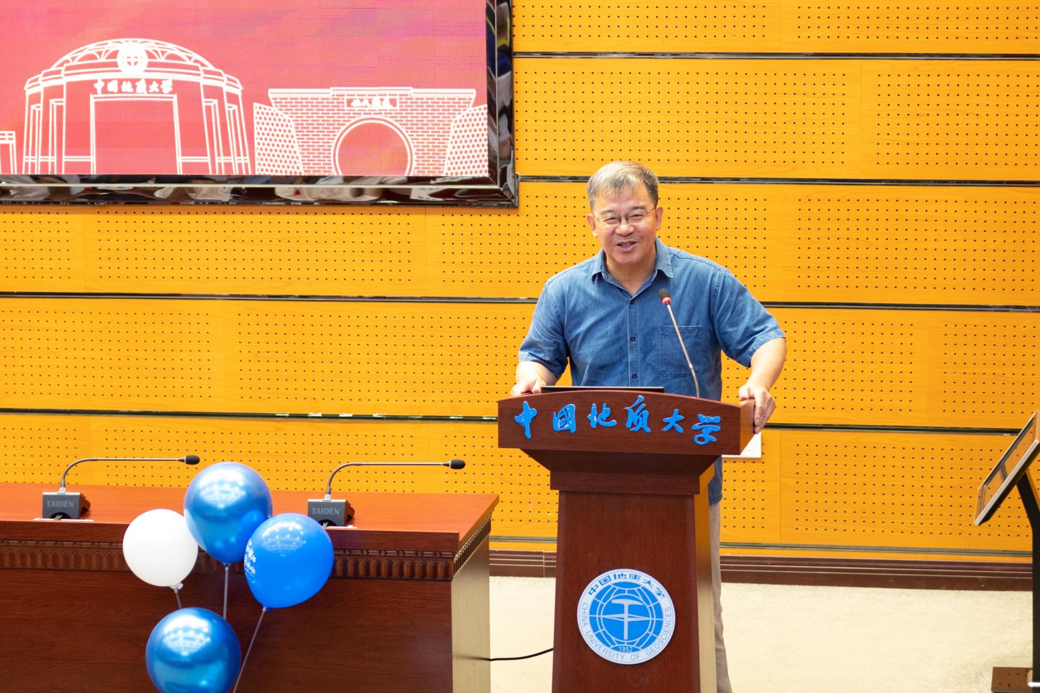 研究生毕业生代表徐赛发言。他结合在地大十年的求学经历分享了自身感悟。毕业后,他即将前往长庆油田,在为保障国家能源资源安全的最前线贡献青春力量,将在地大的所学所得全部熔铸在自己热爱的事业中。他以苏轼的两句词“莫听穿林打叶声,何妨吟啸且徐行”表达对毕业生的祝愿,希望大家走出“象牙塔”、直观地感受复杂多变的社会时,即便只有竹杖芒鞋,也要积极乐观、砥砺前行,搏击风雨、笑傲人生,关关难过关关过,人生漫漫亦灿灿。