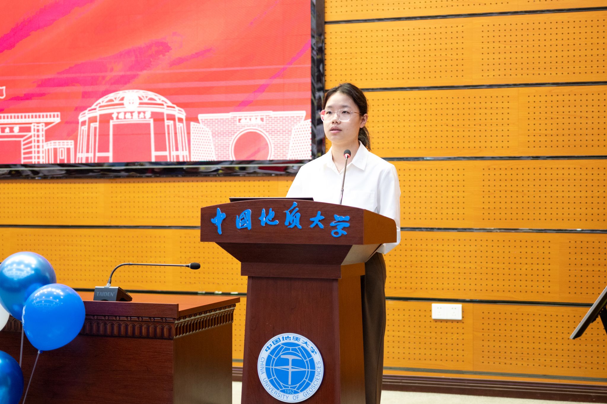 在校生代表、新任员工会执行主席余慧发言。她感慨与学长学姐们共同度过的美好校园时光,对学长学姐圆满完成学业、奔向锦绣前程表示祝贺,并表达了对他们的真切祝福和不舍之情。她说道,全体在校生会以他们为榜样,在求学路上刻苦钻研,脚踏实地,踔厉奋发,勇毅前行,争取早日成长成才,共同肩负起为304.cam永利集团争光,为地大添彩、为国家效力的重任。