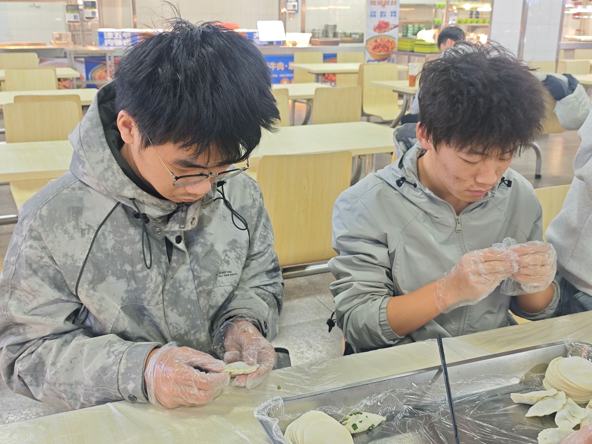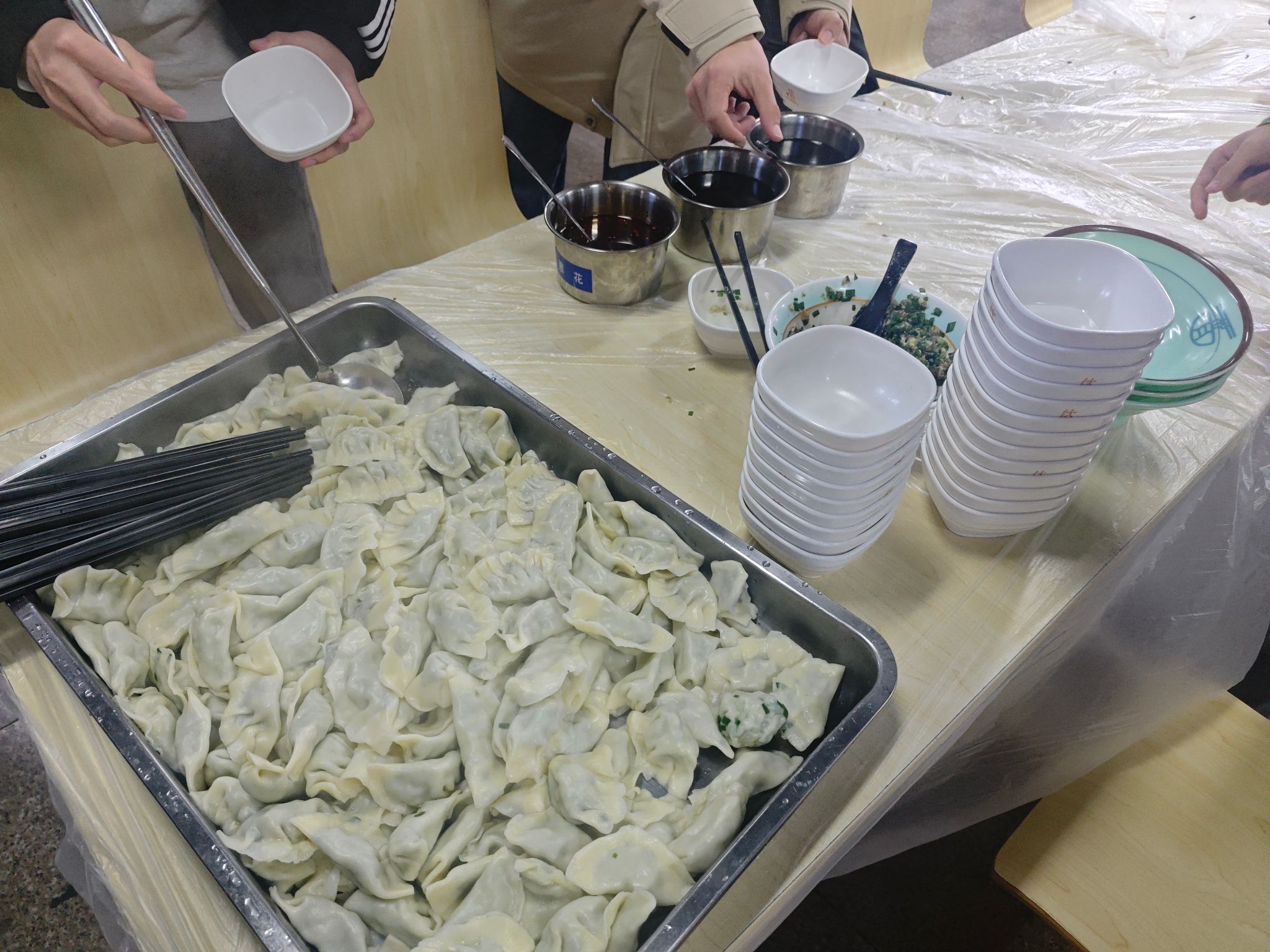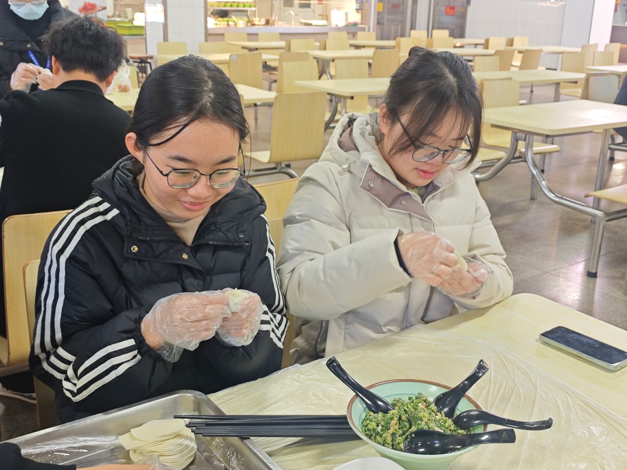 活动现场暖意融融、氛围热烈。400 余张饺子皮分发至四个小组,经验丰富的同学带头示范,新手们积极响应,纷纷亮出包饺子技艺。元宝形、月牙形、麦穗形等形态各异的饺子在大家的巧手下接连诞生。包制过程中,大家围绕南北方冬至习俗、民俗文化内涵展开深入交流,分享“冬至不吃饺子,冻掉耳朵没人管”的趣味俗语,探讨“漏馅不叫漏,叫挣”的吉祥寓意,在欢声笑语中增进了相互了解,党团组织的凝聚力在动手实践中悄然升温。